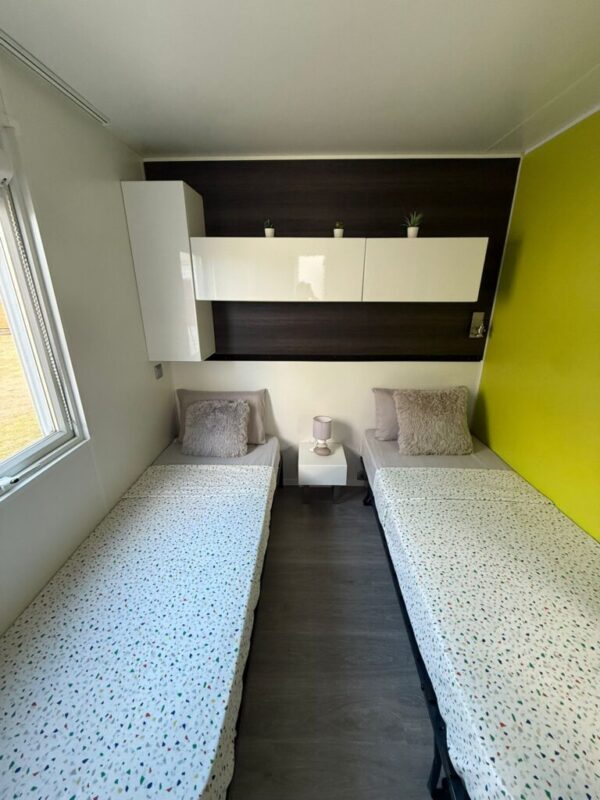 Mobil home moderna de la marca Rapidhome con unas medidas de 8´8×4´20 m 2 dormitorios, cocina, cuarto de baño, salón comedor y climalit.